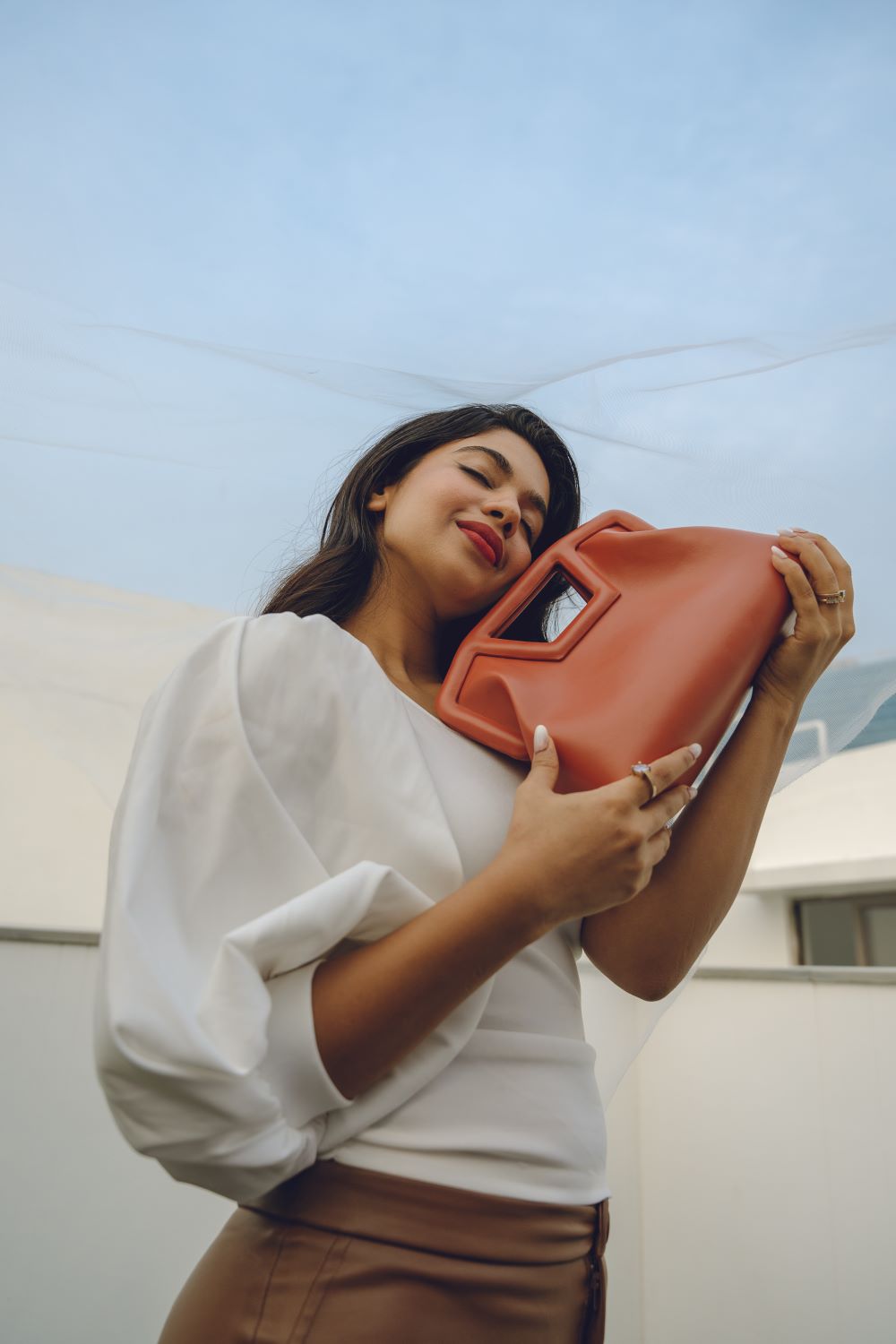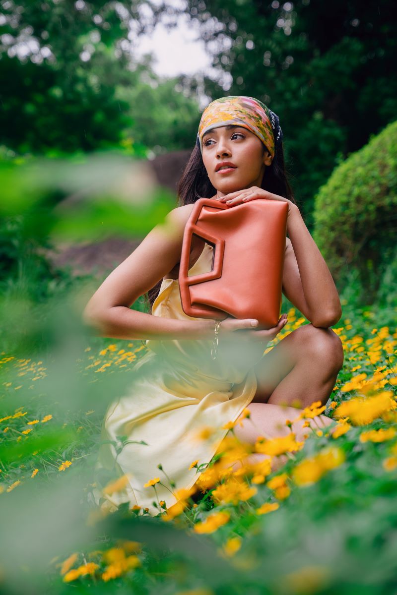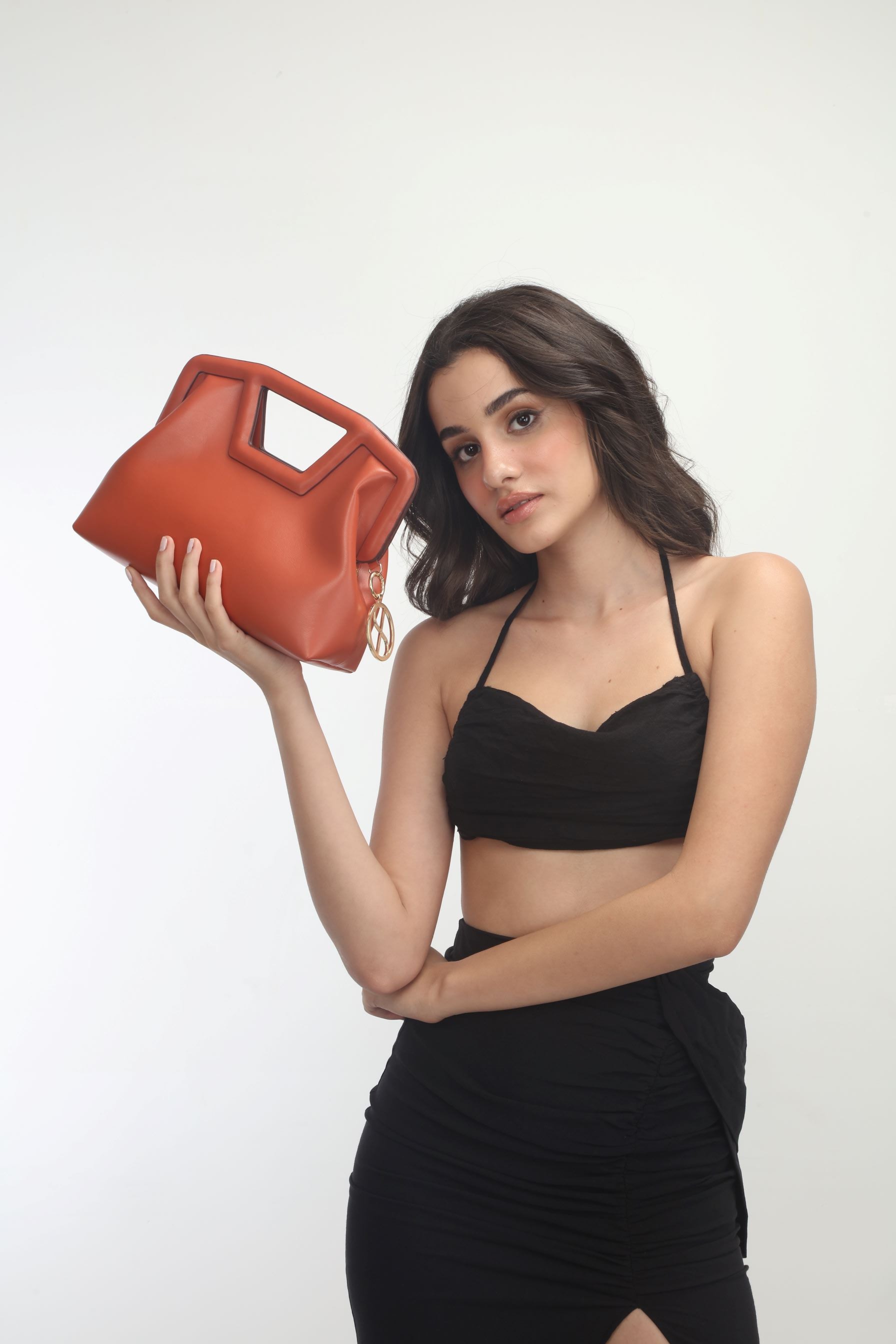Punya can be carried like a clutch, by the handle, or like a cross-body bag.