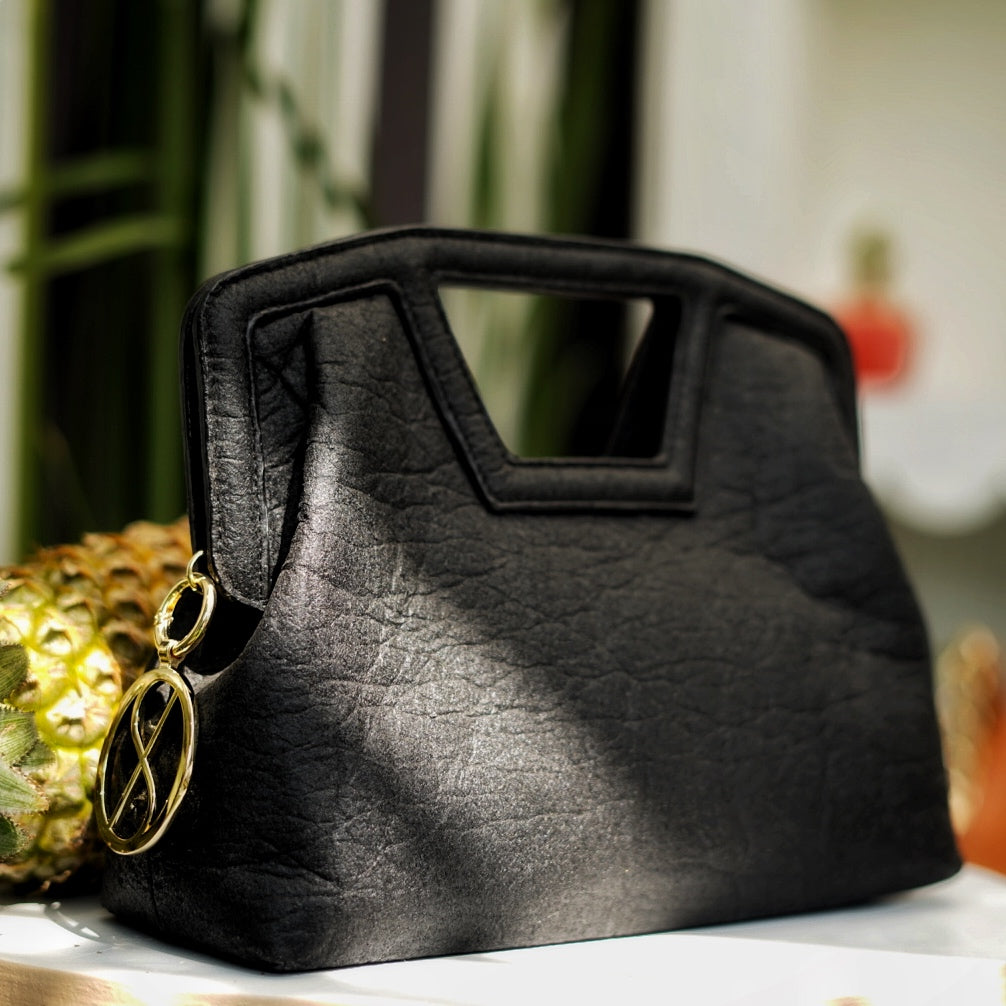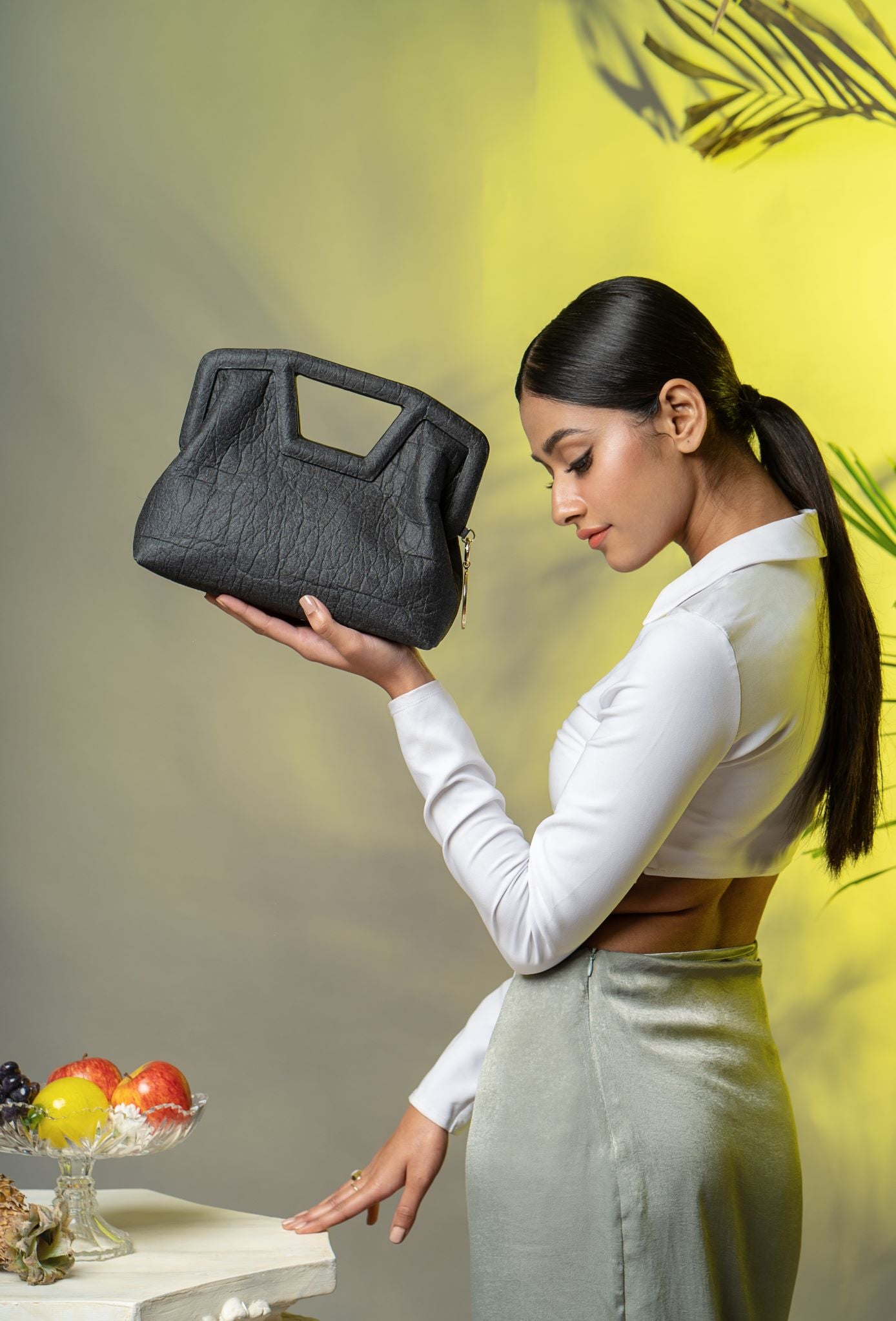 Punya charcoal is made from pineapple leather. The inner lining of the Punya is made from organic cotton. The intricatly designed print used in Punya is designed by a South Indian mehndi (henna) artist, adding a touch of our vibrant Indianculture to this classic bag.
